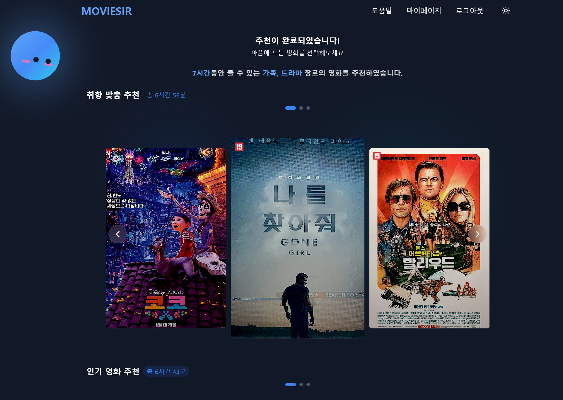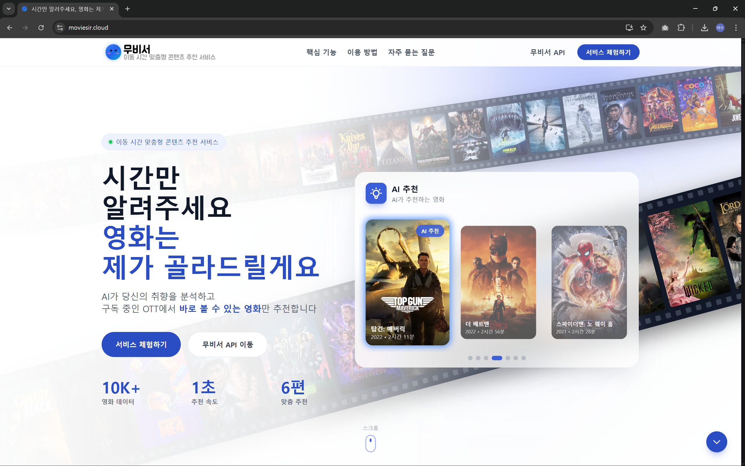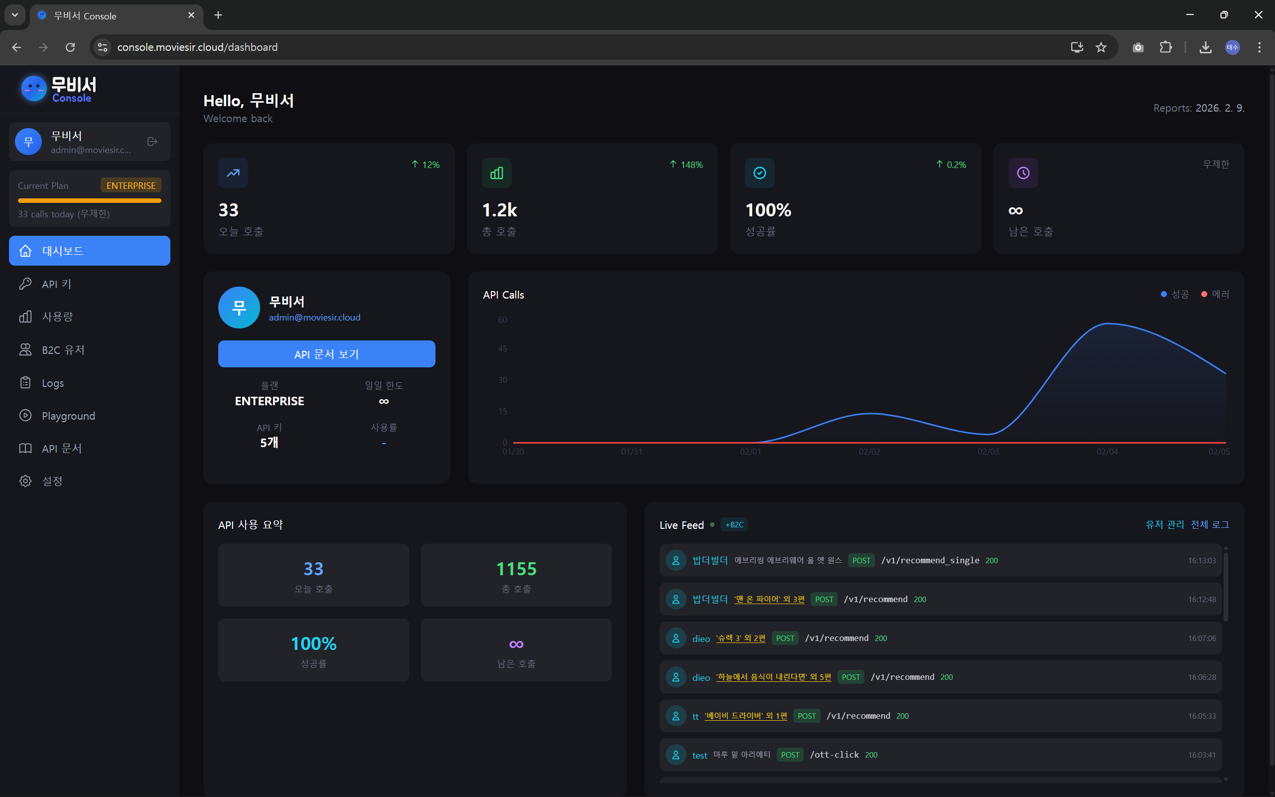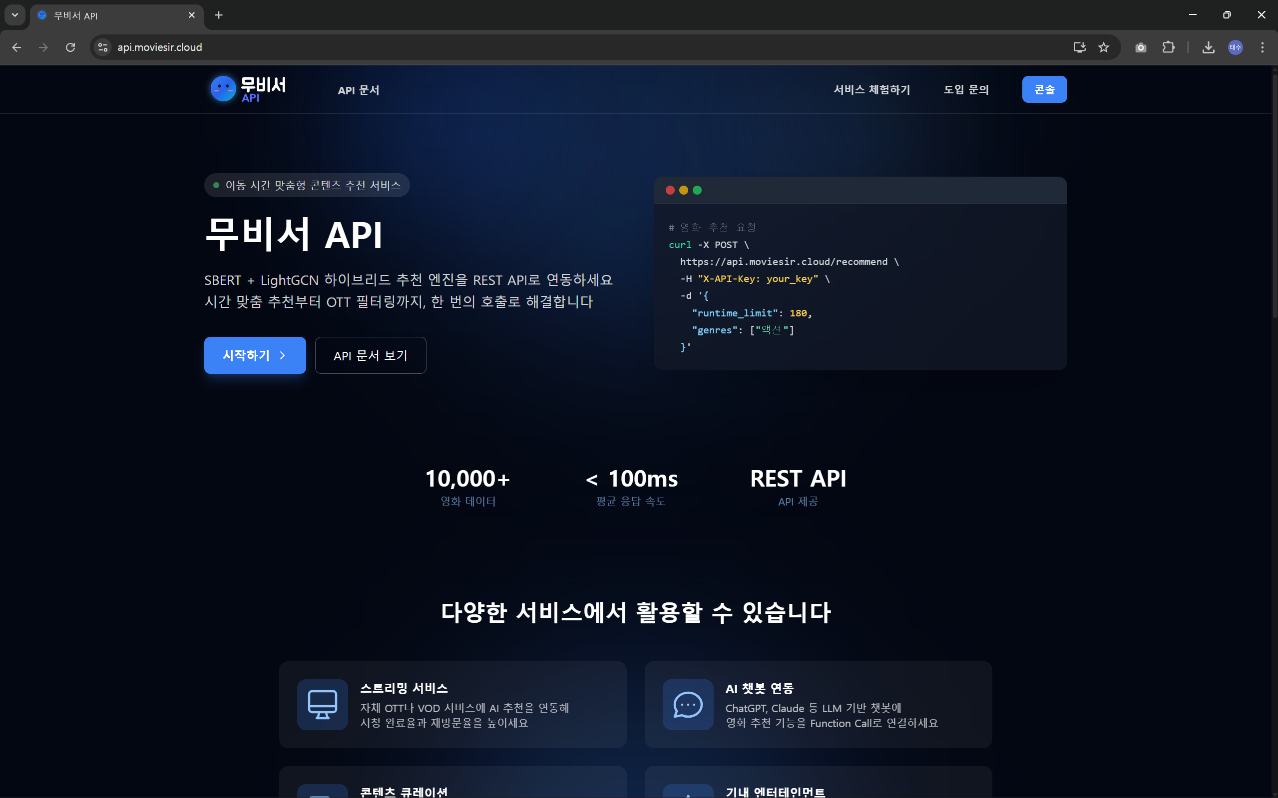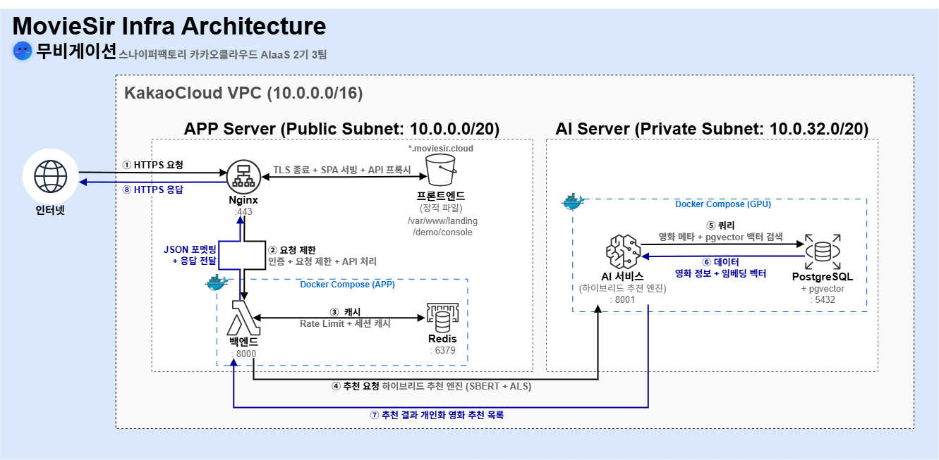SBERT + ALS 하이브리드 알고리즘 기반의 영화 추천 서비스. 기업 고객이 B2B Console에서 API Key를 발급받아 자사 서비스에 연동하는 구조로, External API 분리 설계와 Rate Limiting 기반 플랜별 과금 체계를 구축했습니다. 카카오클라우드 2-Tier VPC 아키텍처 설계, 4계층 보안 방어 체계, CI/CD 파이프라인 자동화, Cron 기반 서버 운영 자동화를 담당했습니다.