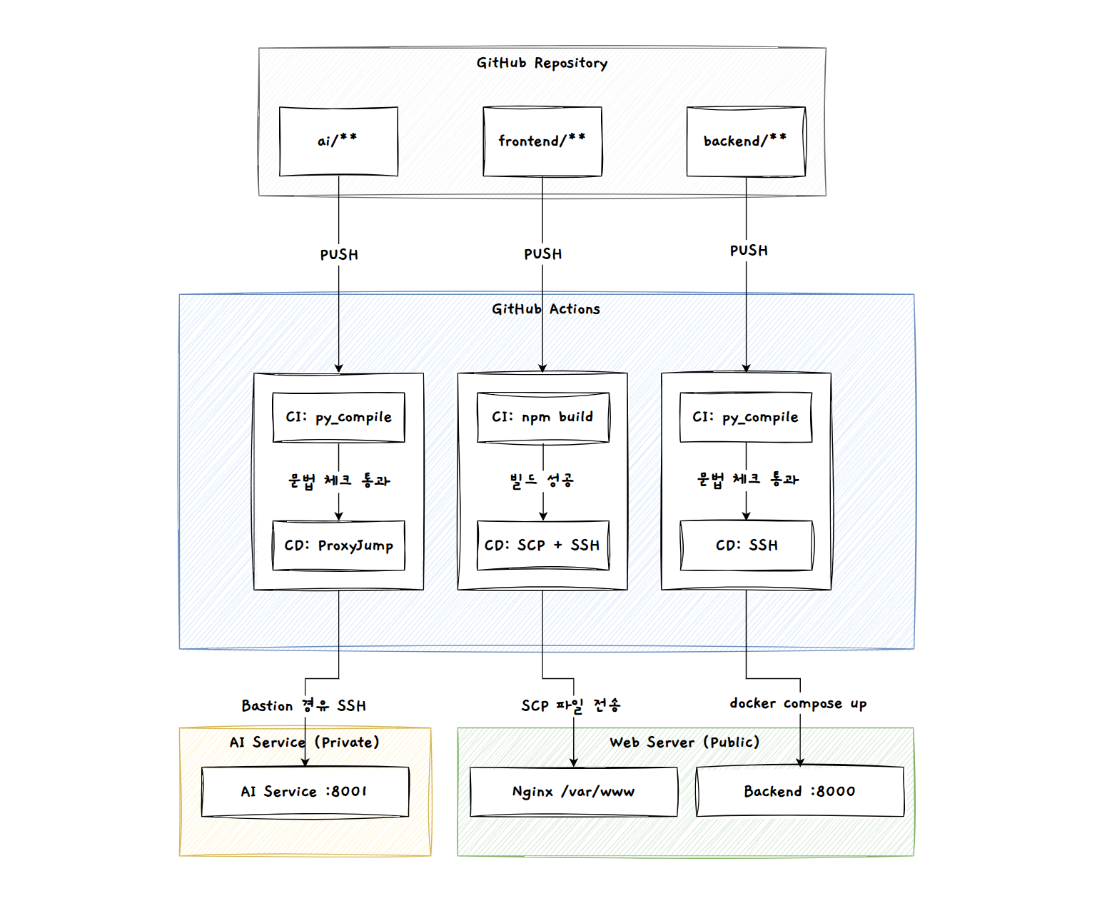 수동 배포 시 휴먼 에러 발생. GPU 서버가 Private Subnet이라 GitHub Actions에서 직접 접근 불가.