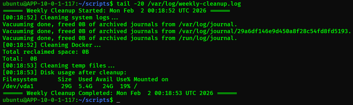 # 매주 금요일 자동 정리 0 17 * * 5 /home/ubuntu/scripts/weekly-cleanup.sh # journalctl 7일 이전 로그 삭제 + Docker prune